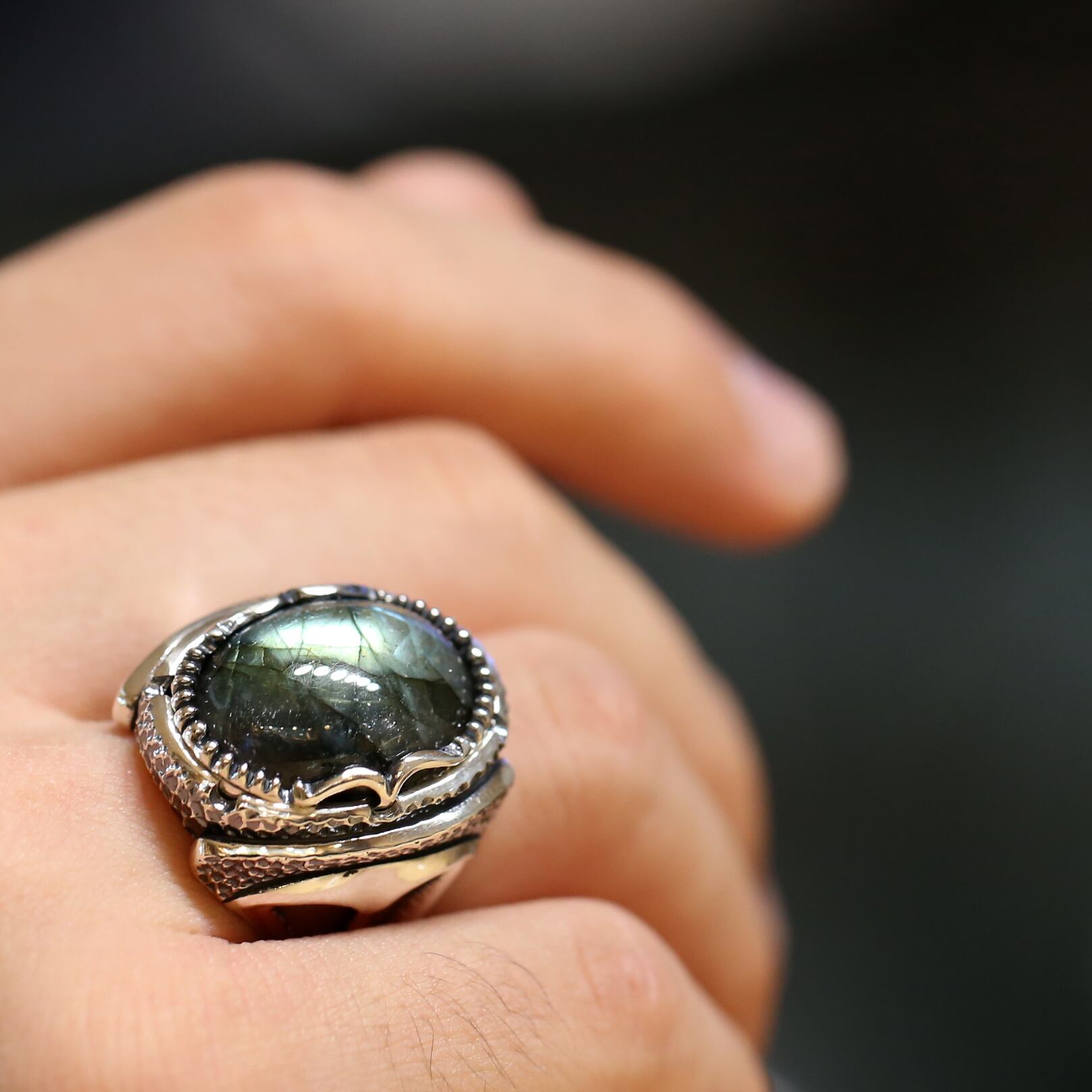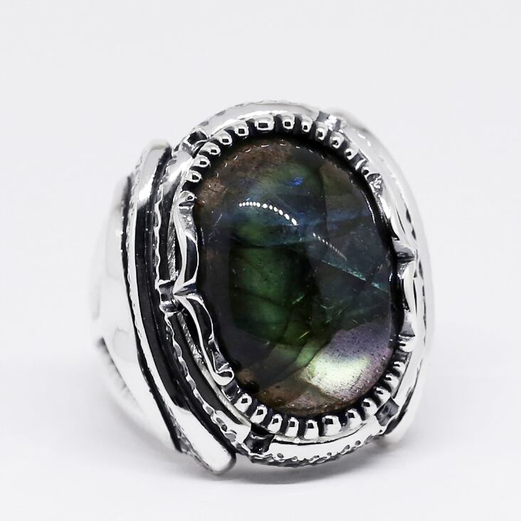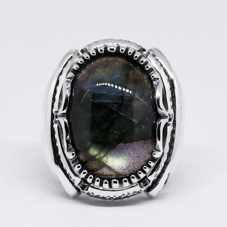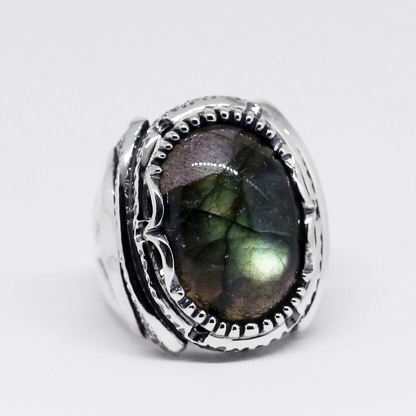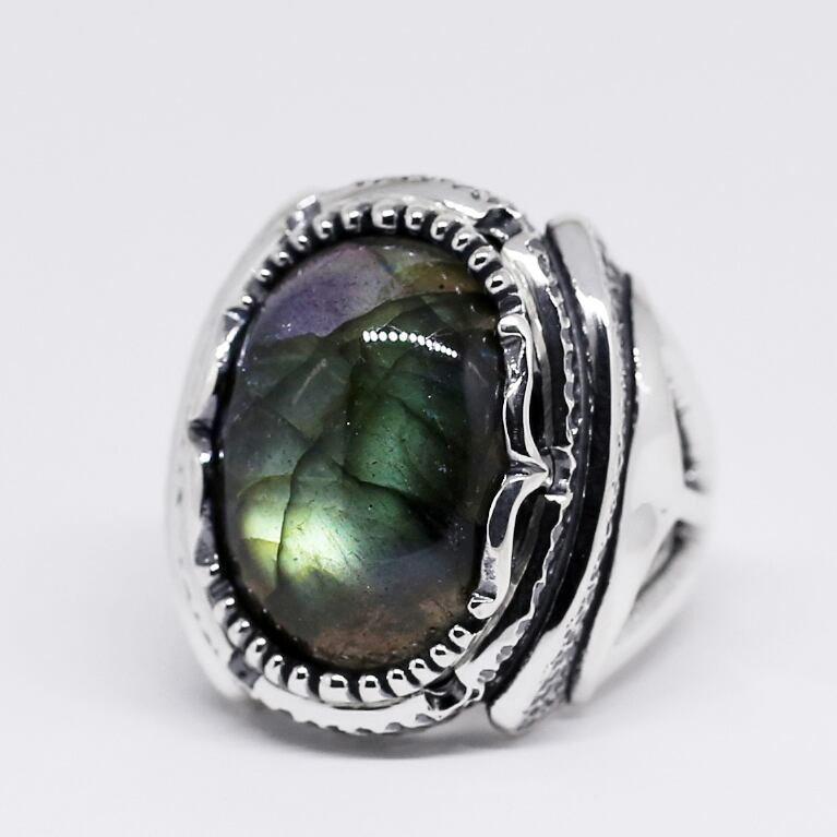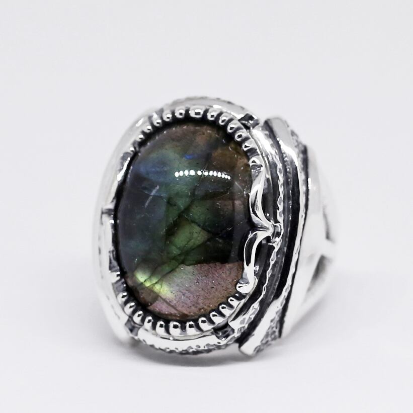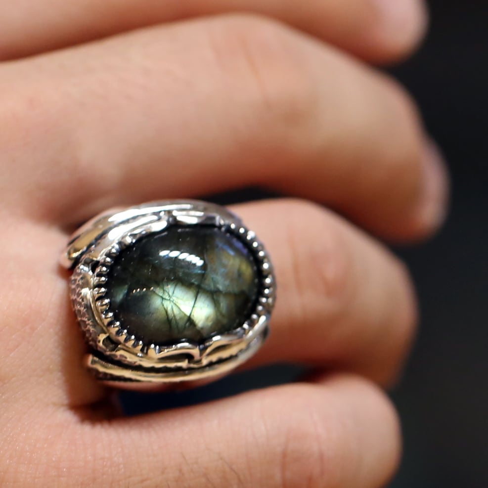 ボリュームのある大粒ラブラドライトが主役のリング。