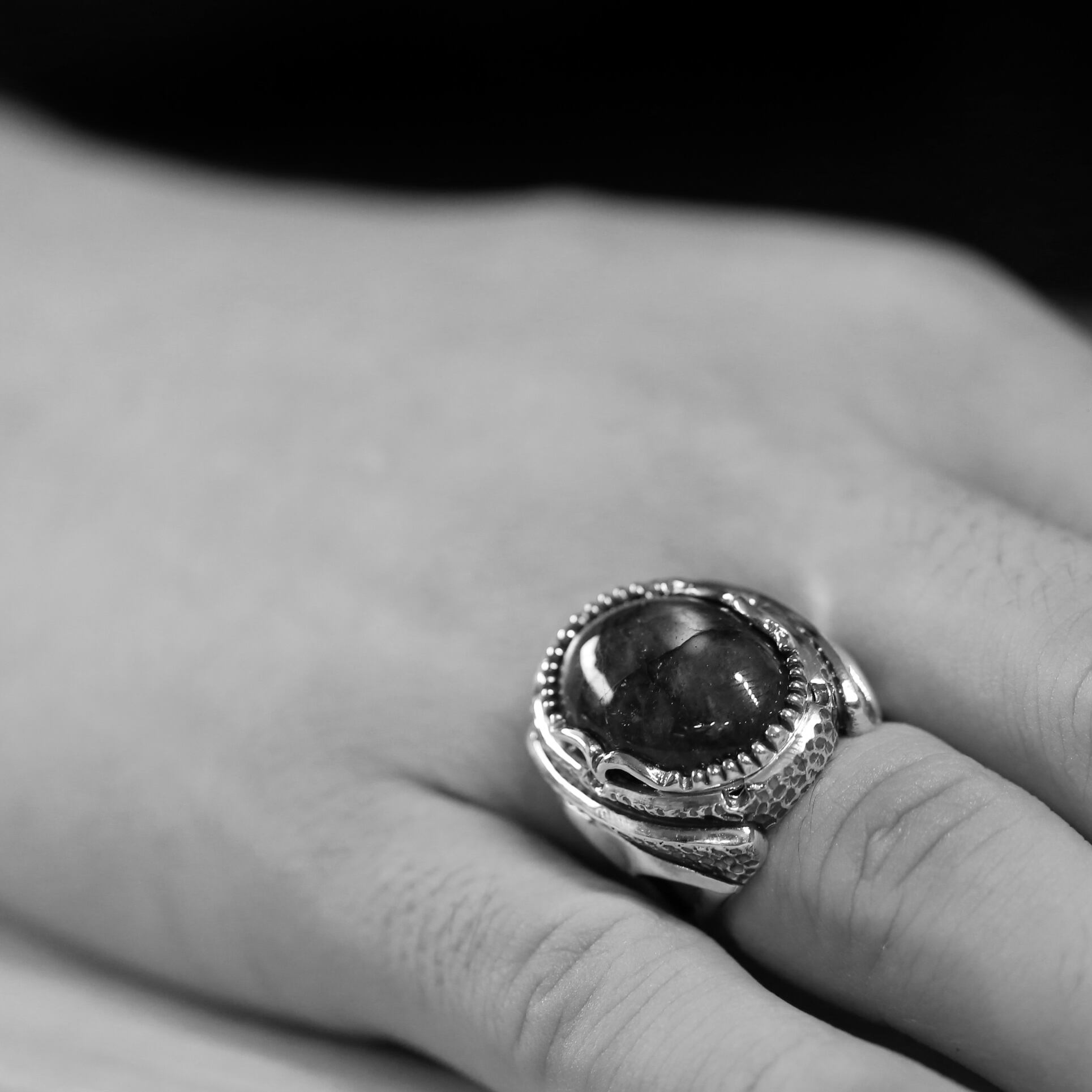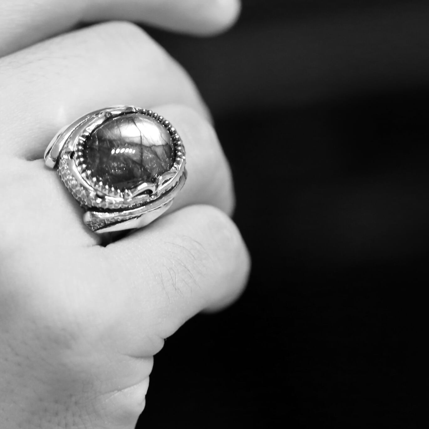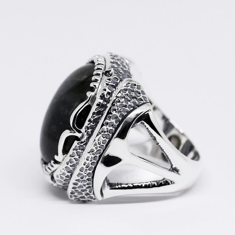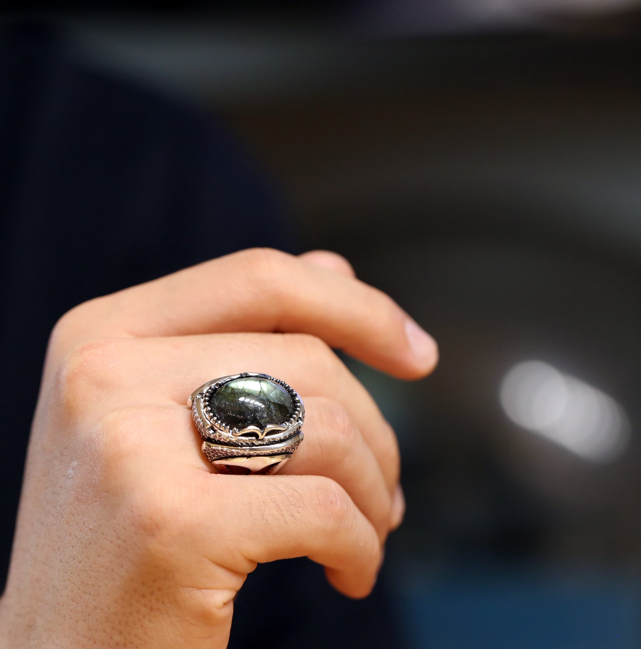 ボリュームのある大粒ラブラドライトが主役のリング。