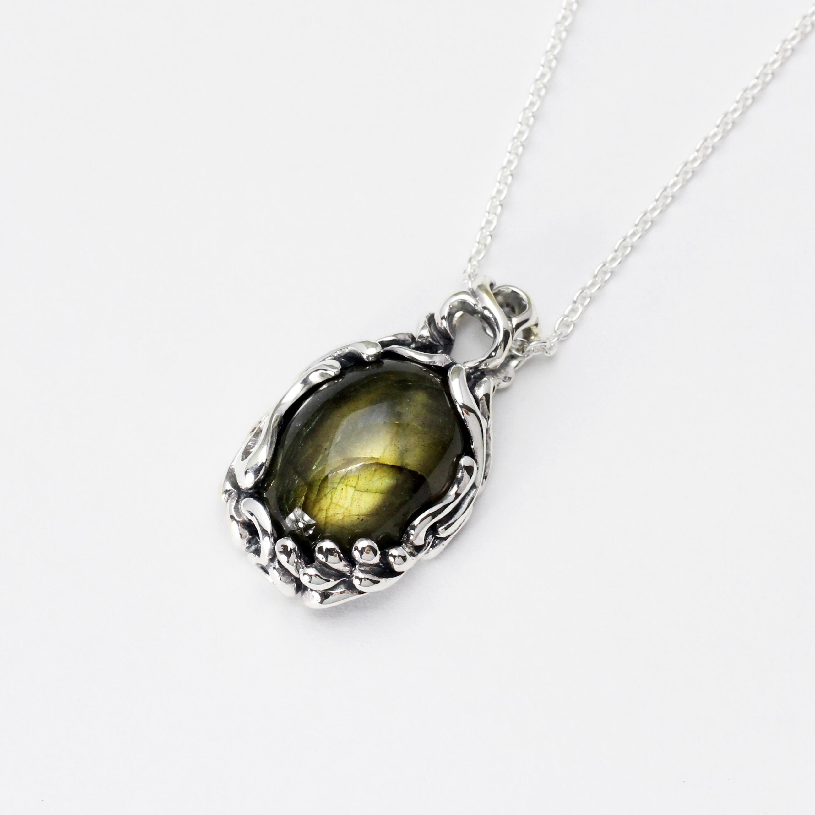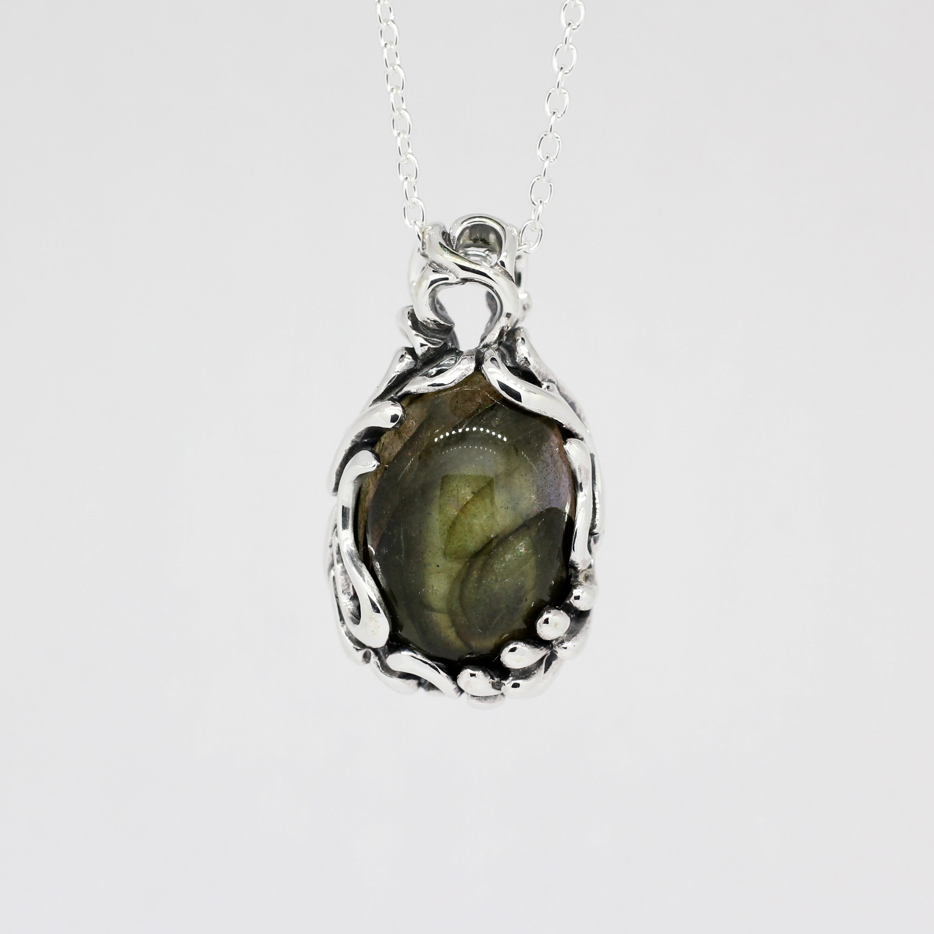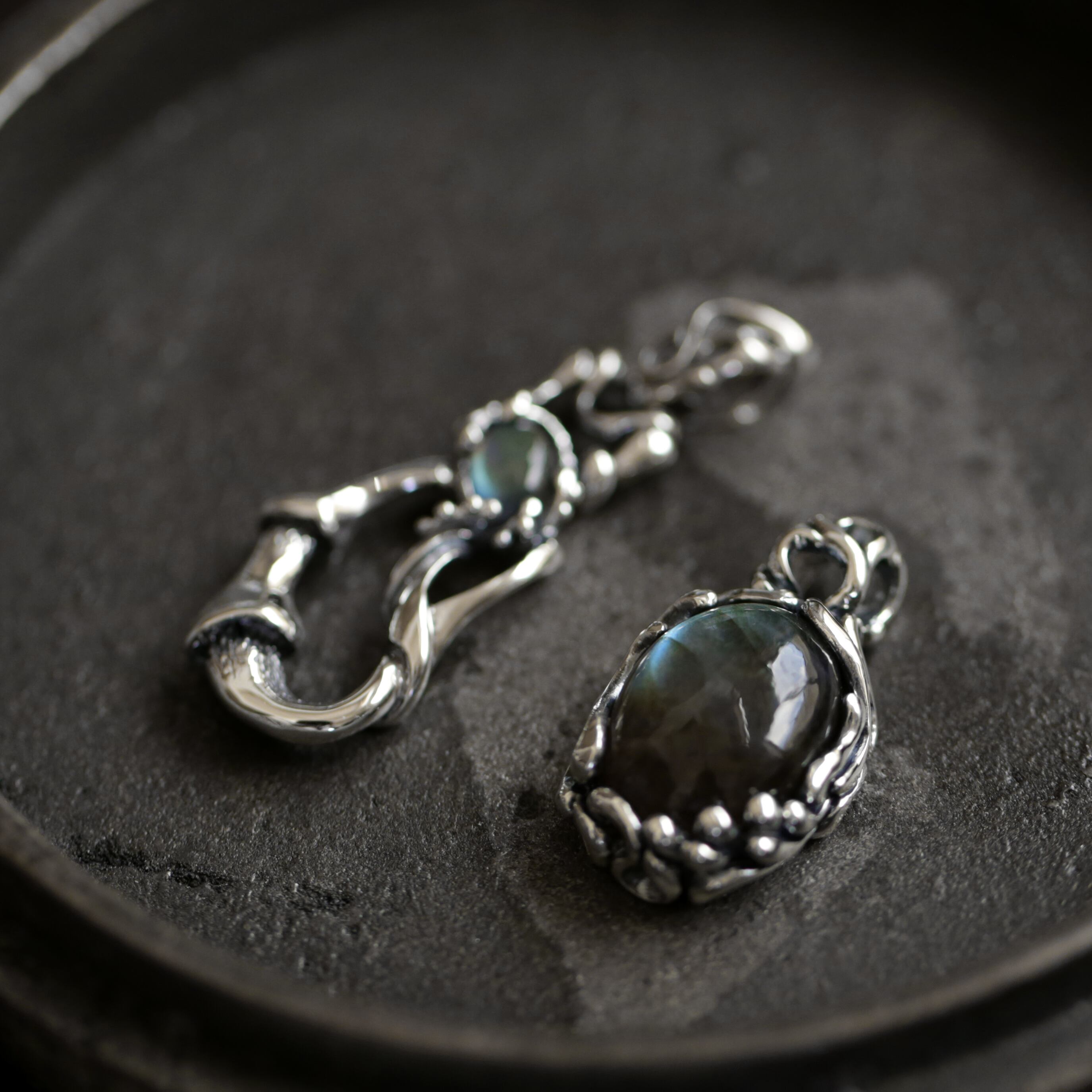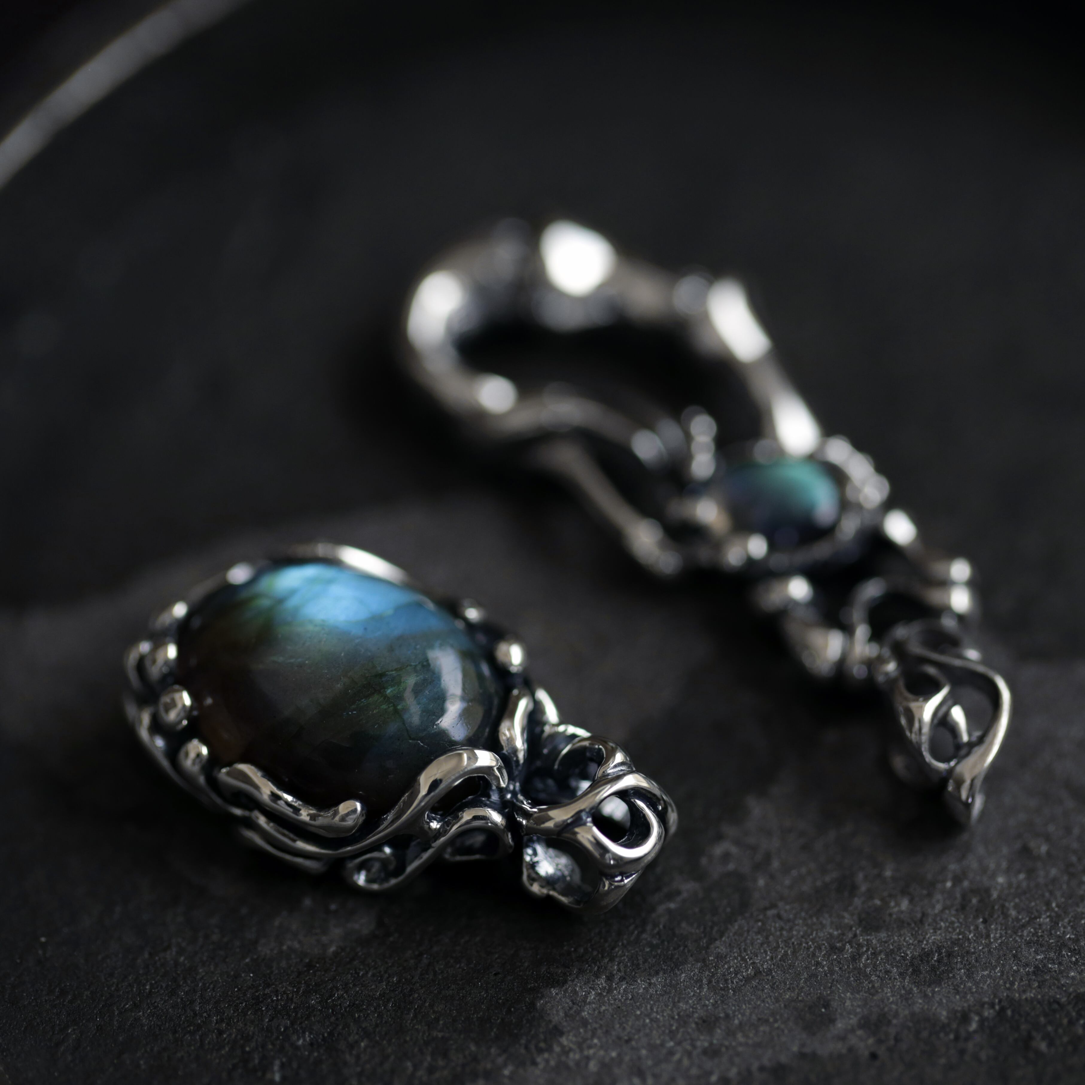 不規則に流れる曲線の中に大粒なラブラドライトをセッティング。