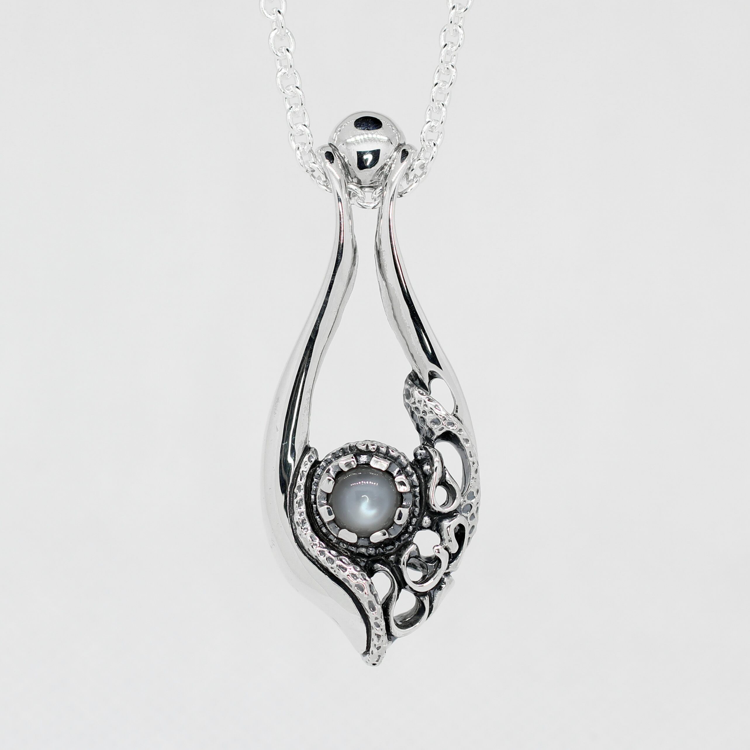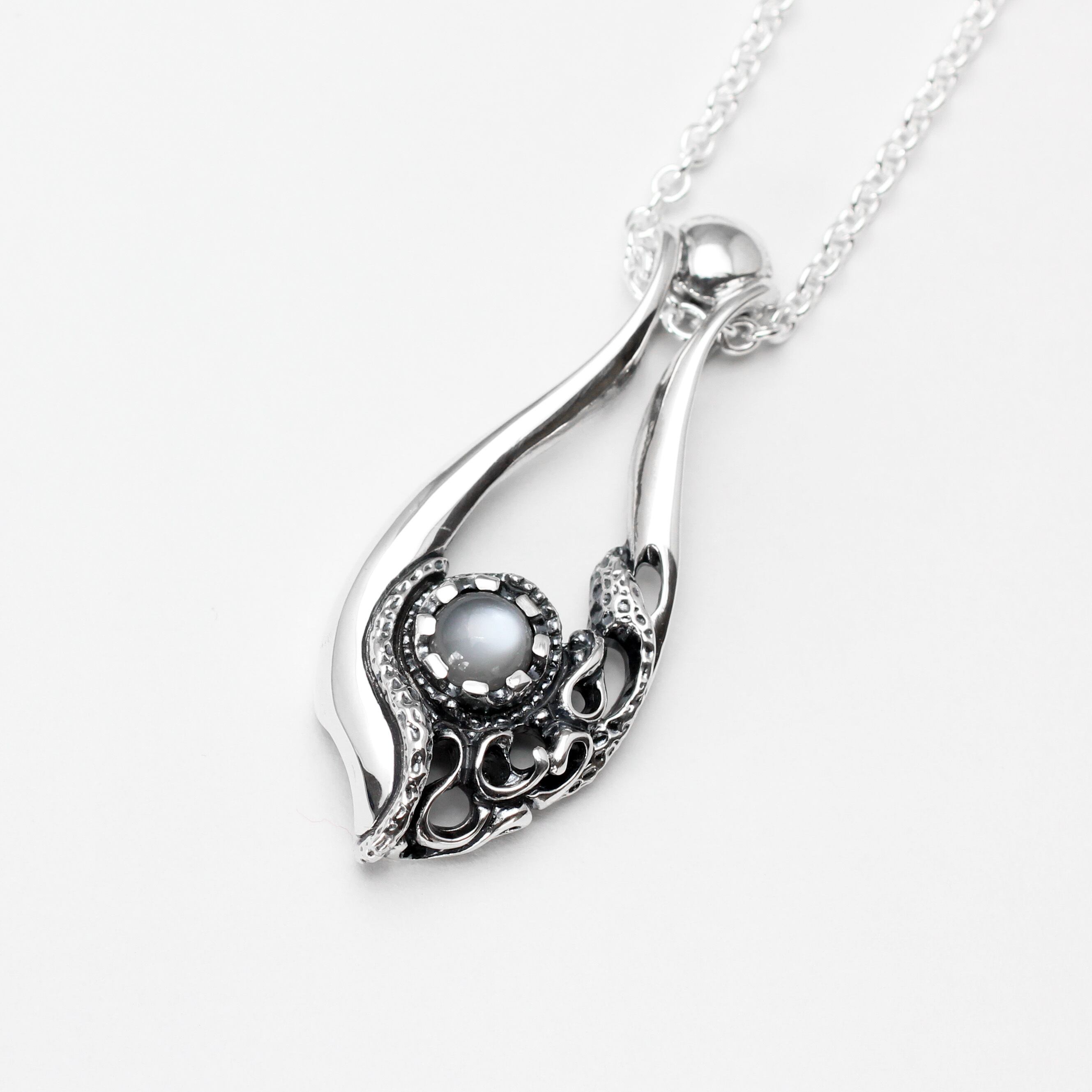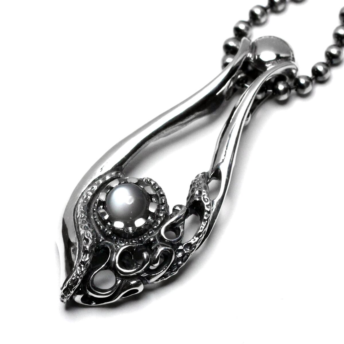 下部に重みを持たせ、ラインと鏡面を活かした美しさを追求した逸品。グレームーンストーンの落ち着きのある輝きがさりげない主張を魅せる。