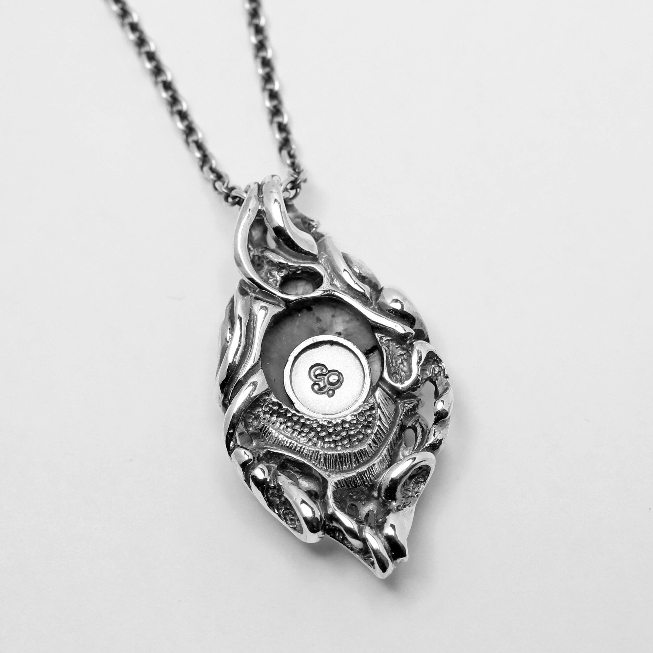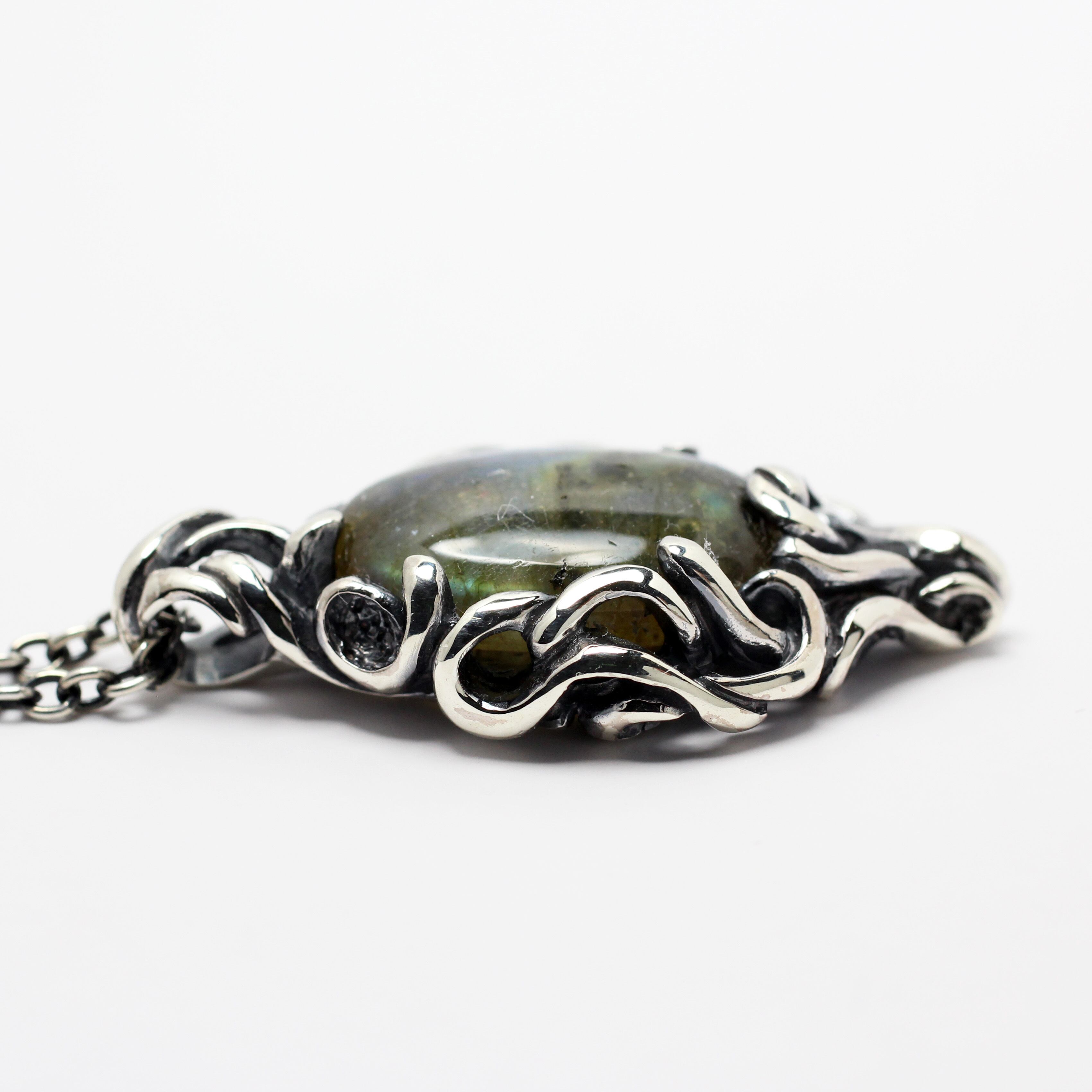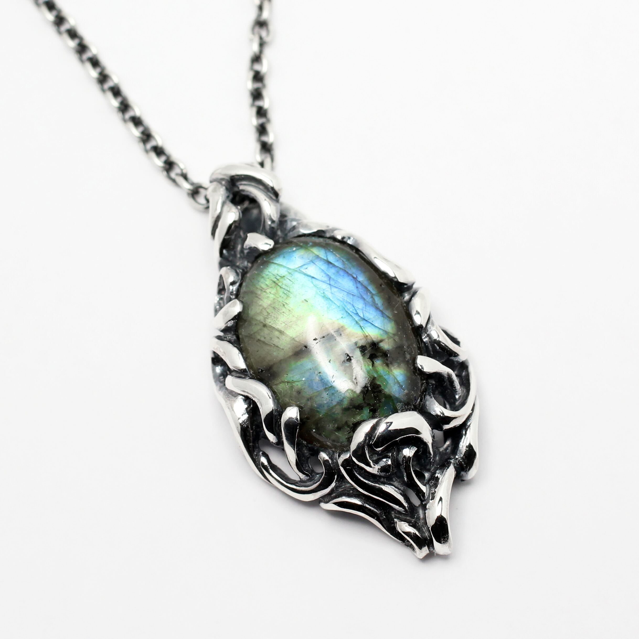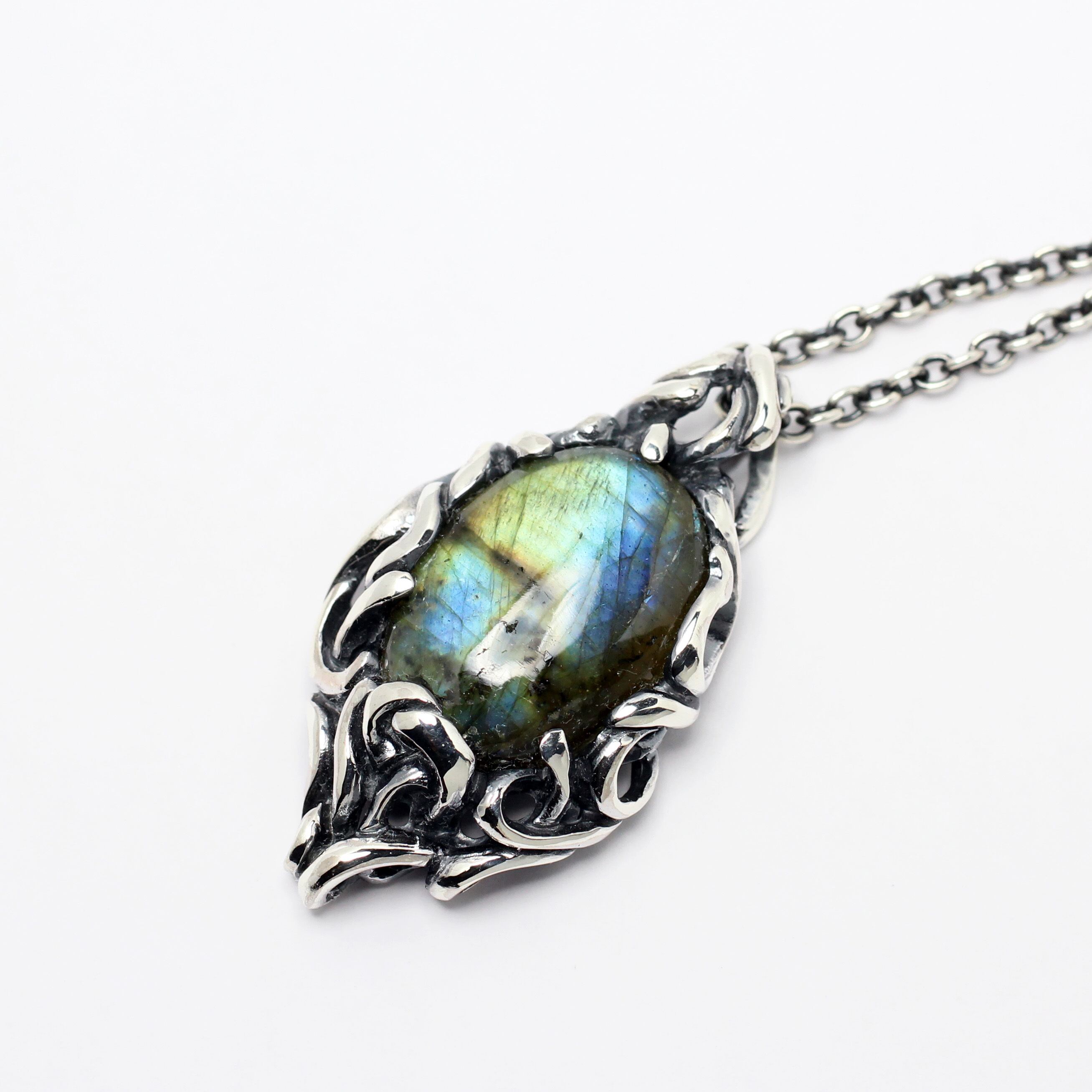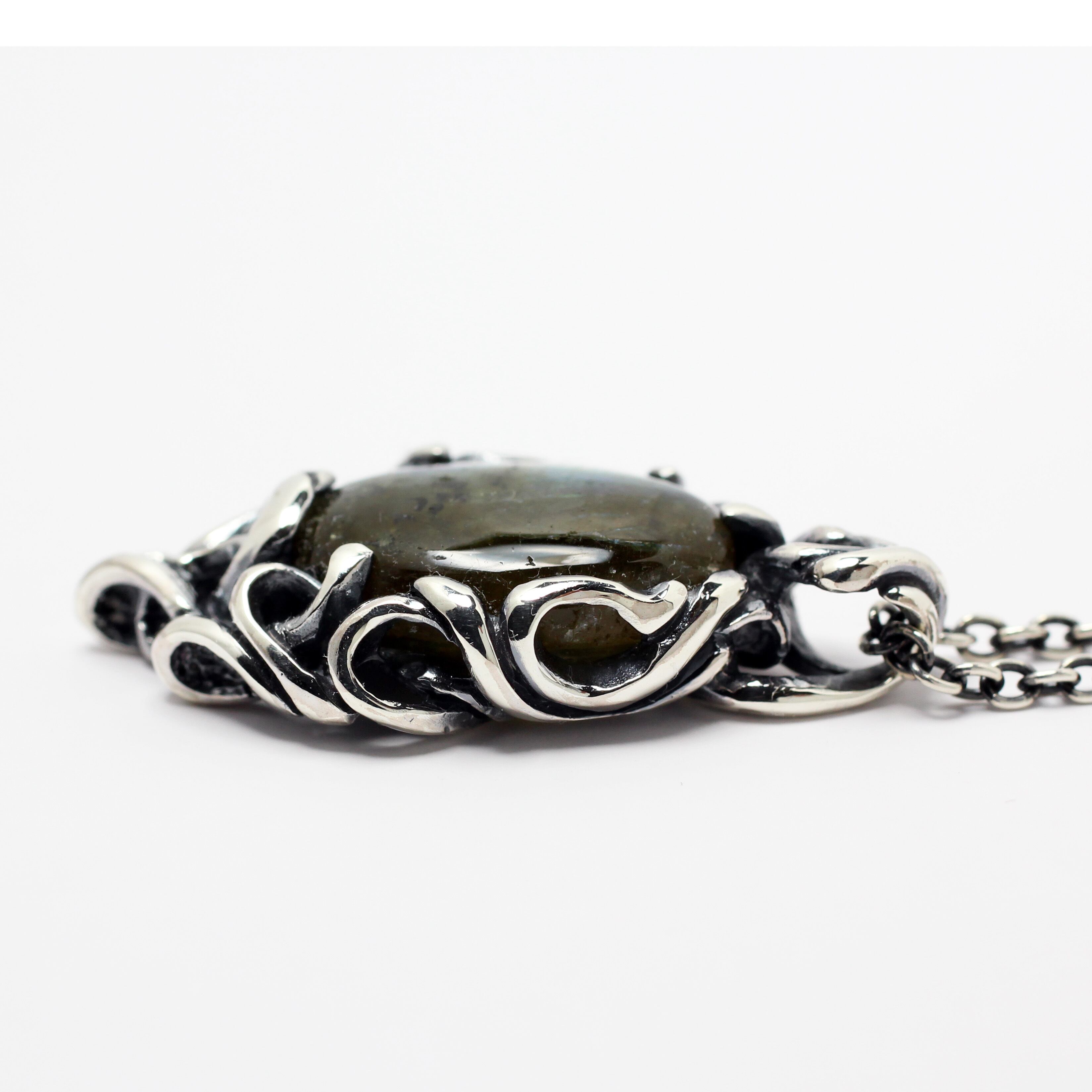 不規則に流れる曲線の中に大粒のラブラドライトをセッティング。どこから見ても動きのある飽きの来ないペンダントトップ。