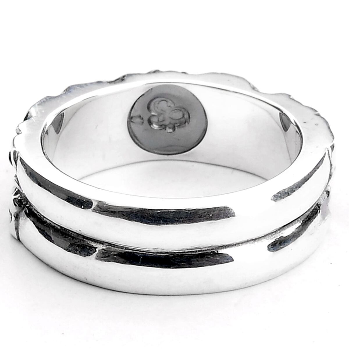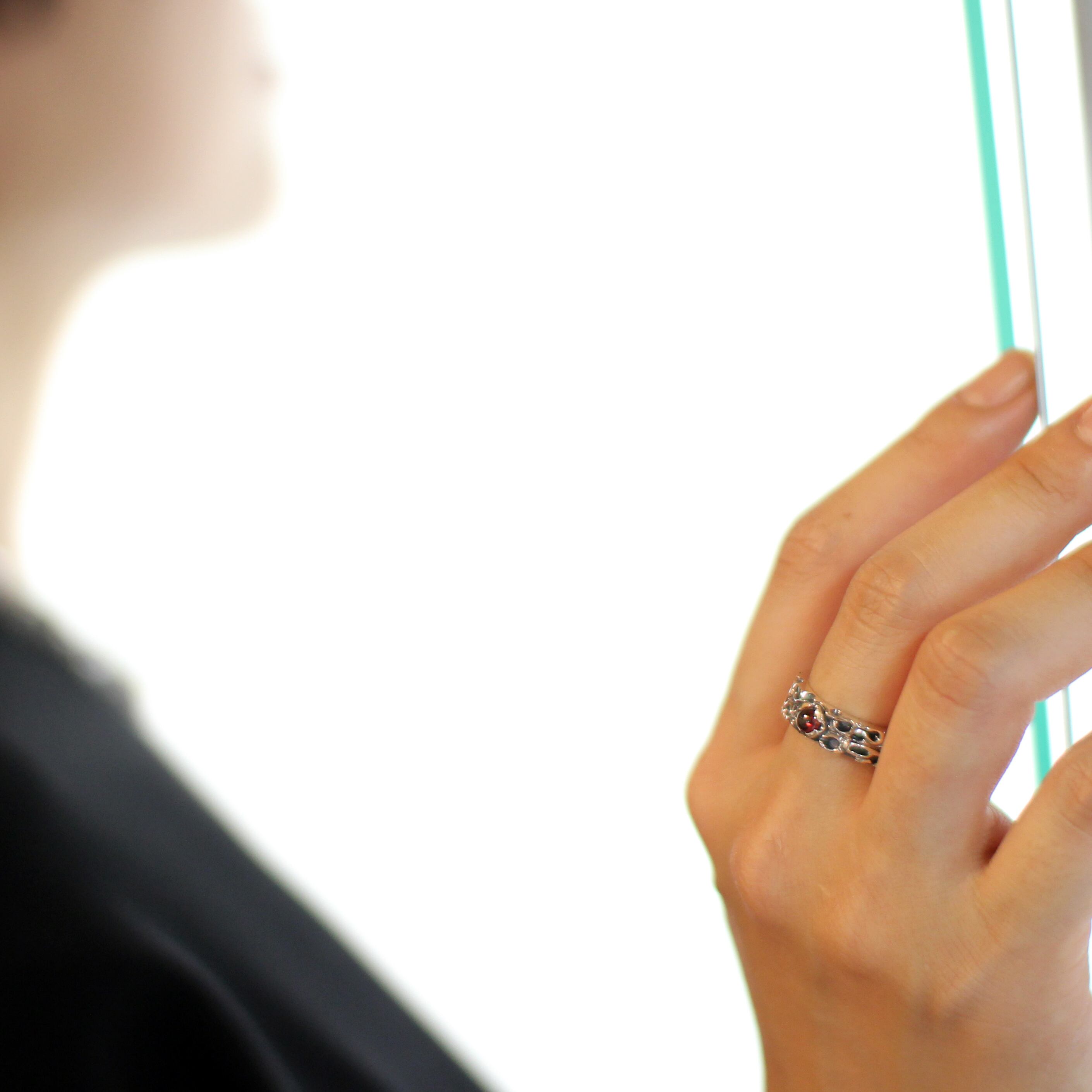 シンプルなシルエットの中に蠢くラインと中央にセッティングされた天然石がアクセントになっている。