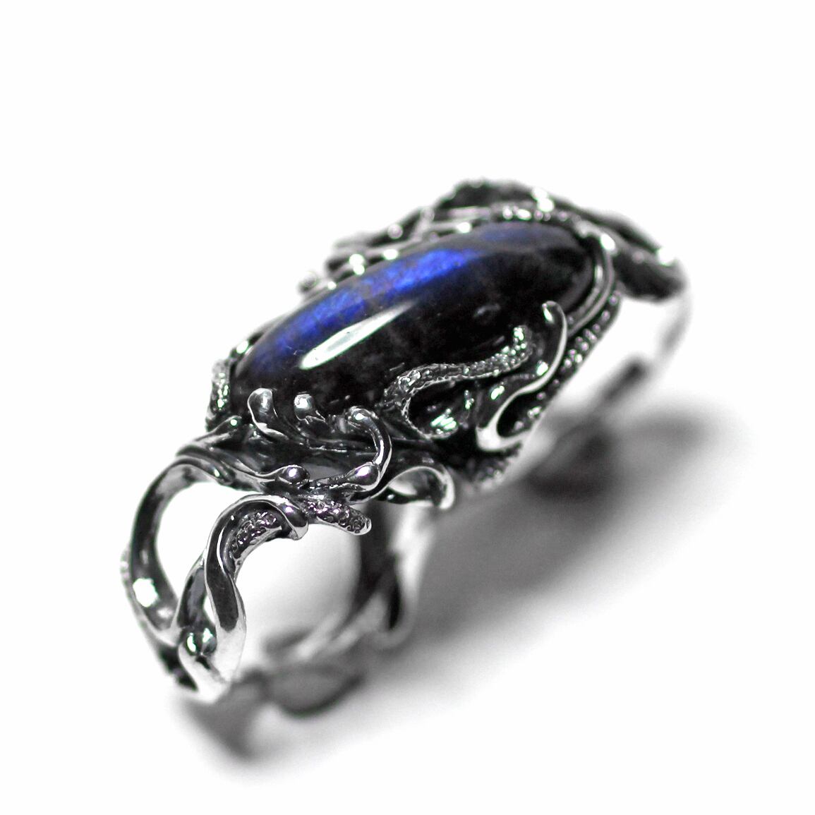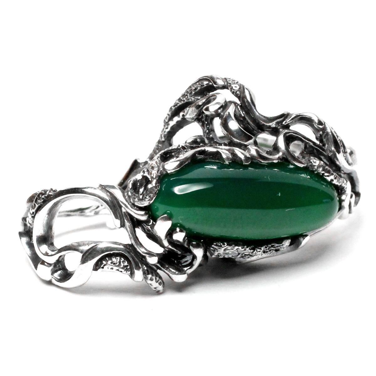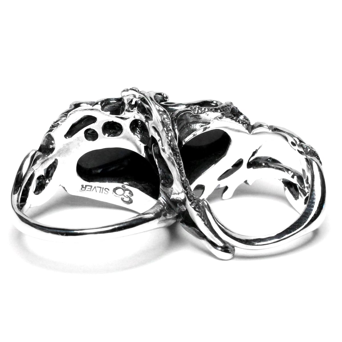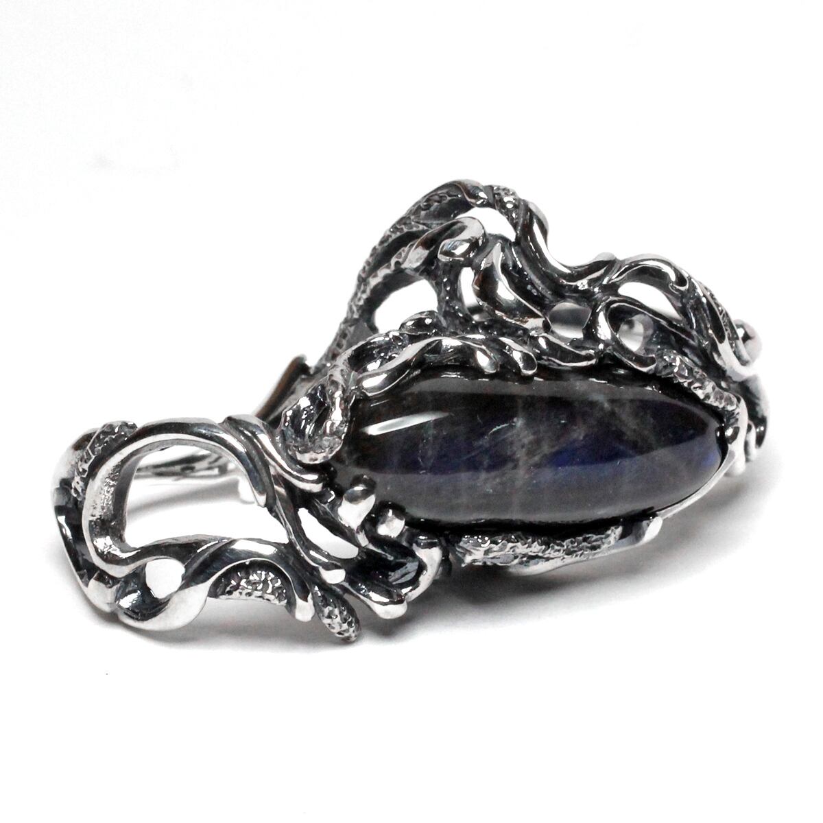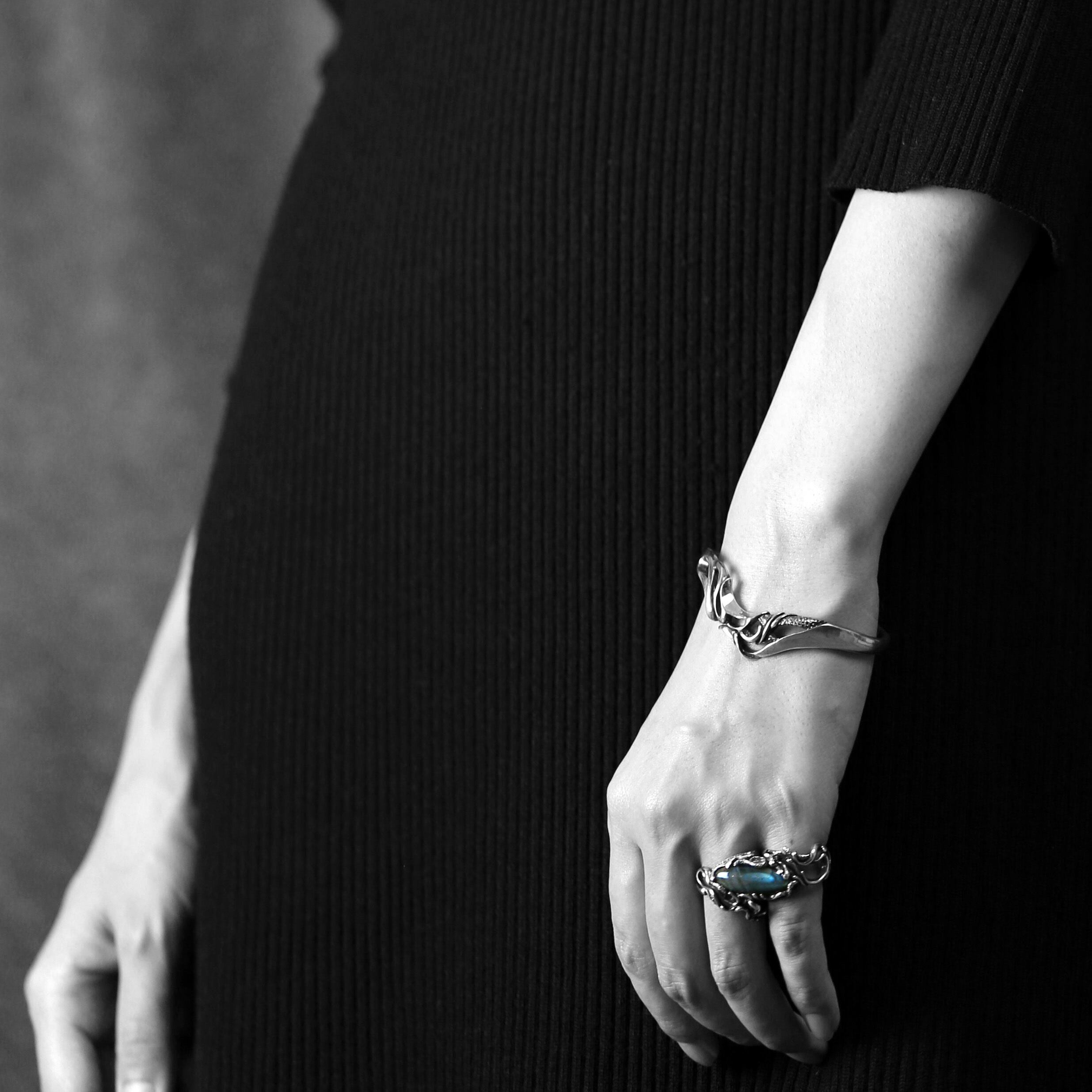 横長シルエットの天然石を大胆に配置した二本差しリング。それぞれの指をめぐるようなラインワークが魅せる逸品。
