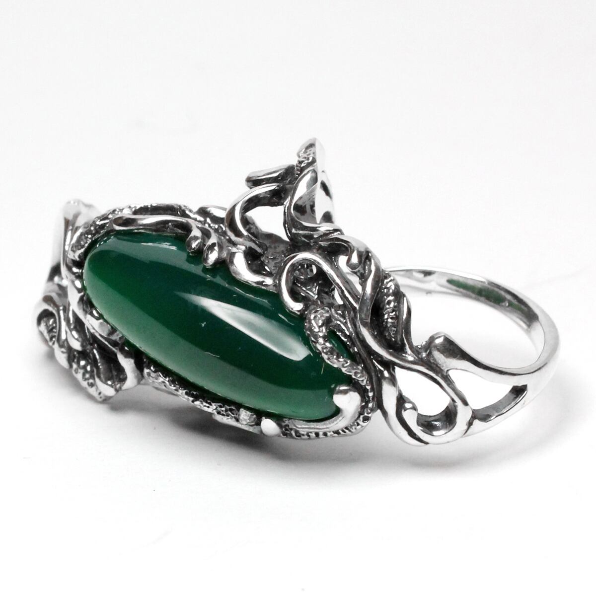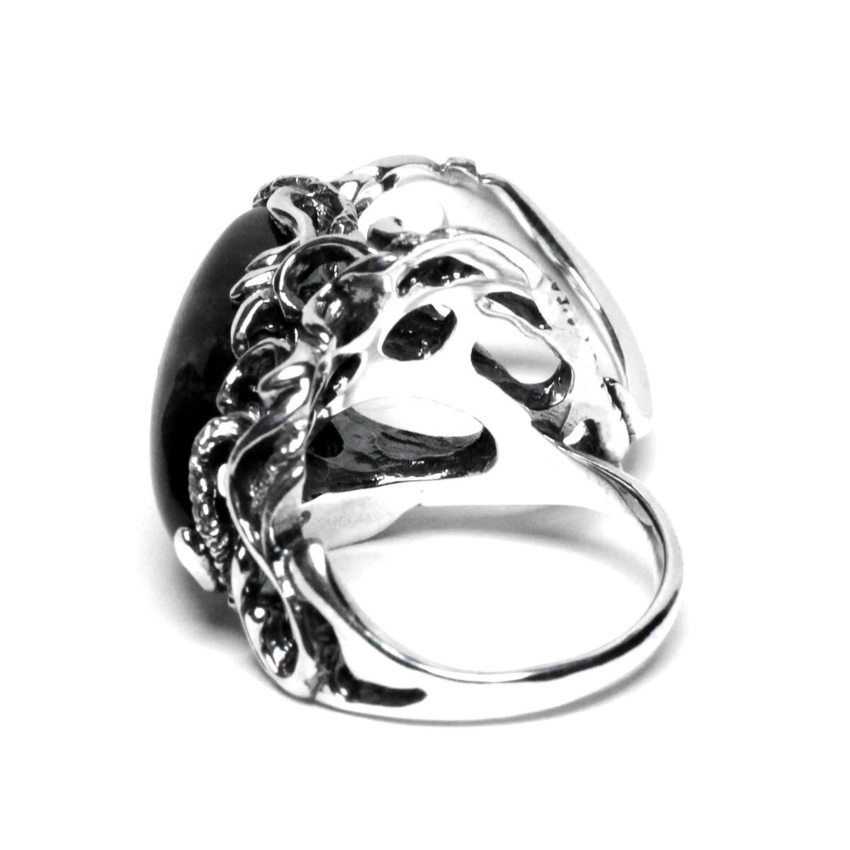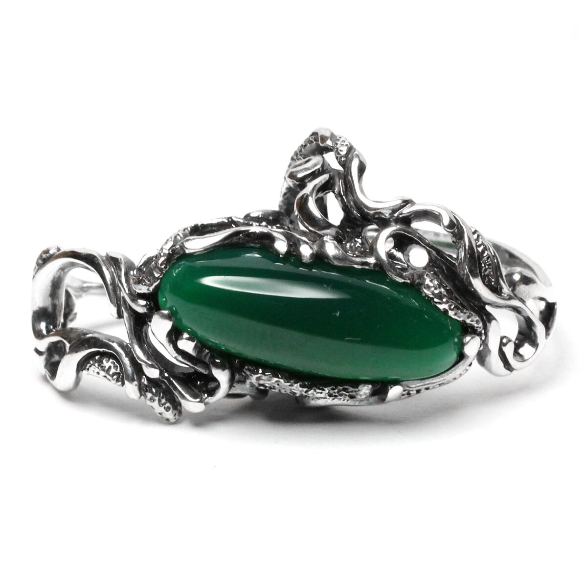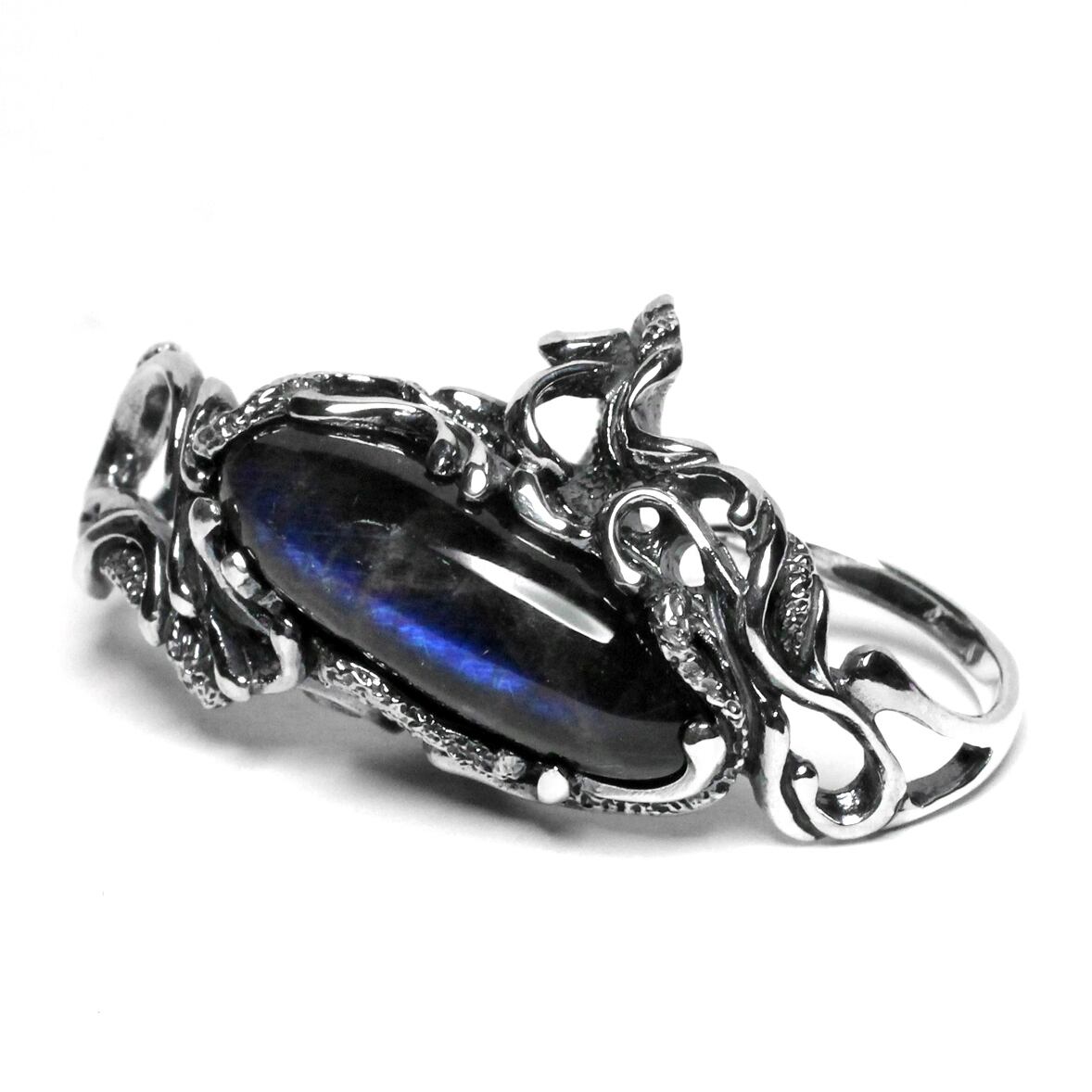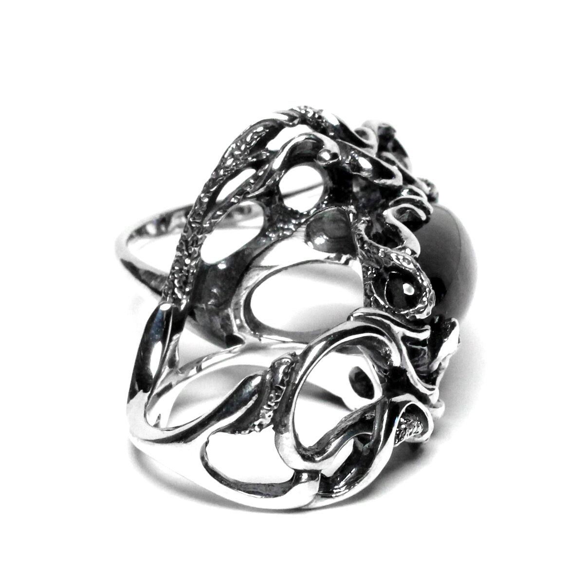 横長シルエットの天然石を大胆に配置した二本差しリング。それぞれの指をめぐるようなラインワークが魅せる逸品。