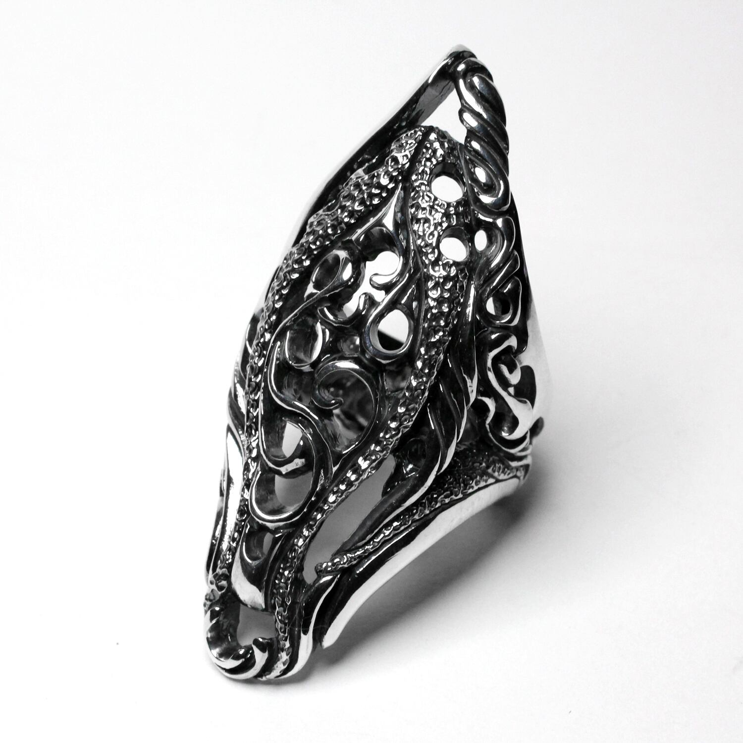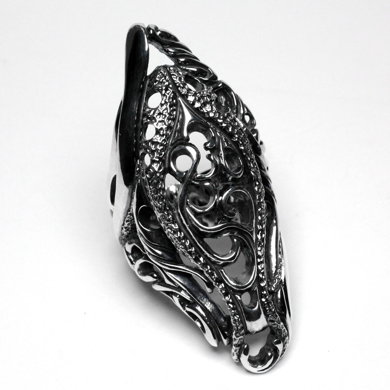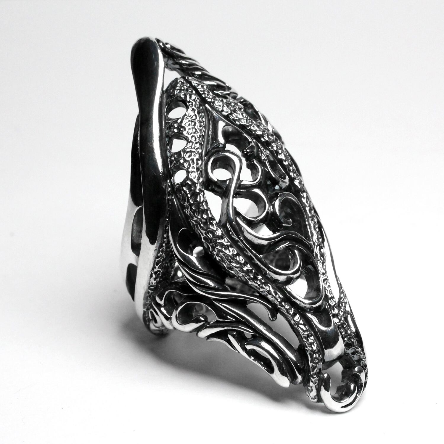約55mmのインパクト抜群のリング。左右対称のシルエットだが、部分的に異なる曲線や曲面が不規則なようでまとまった逸品。
