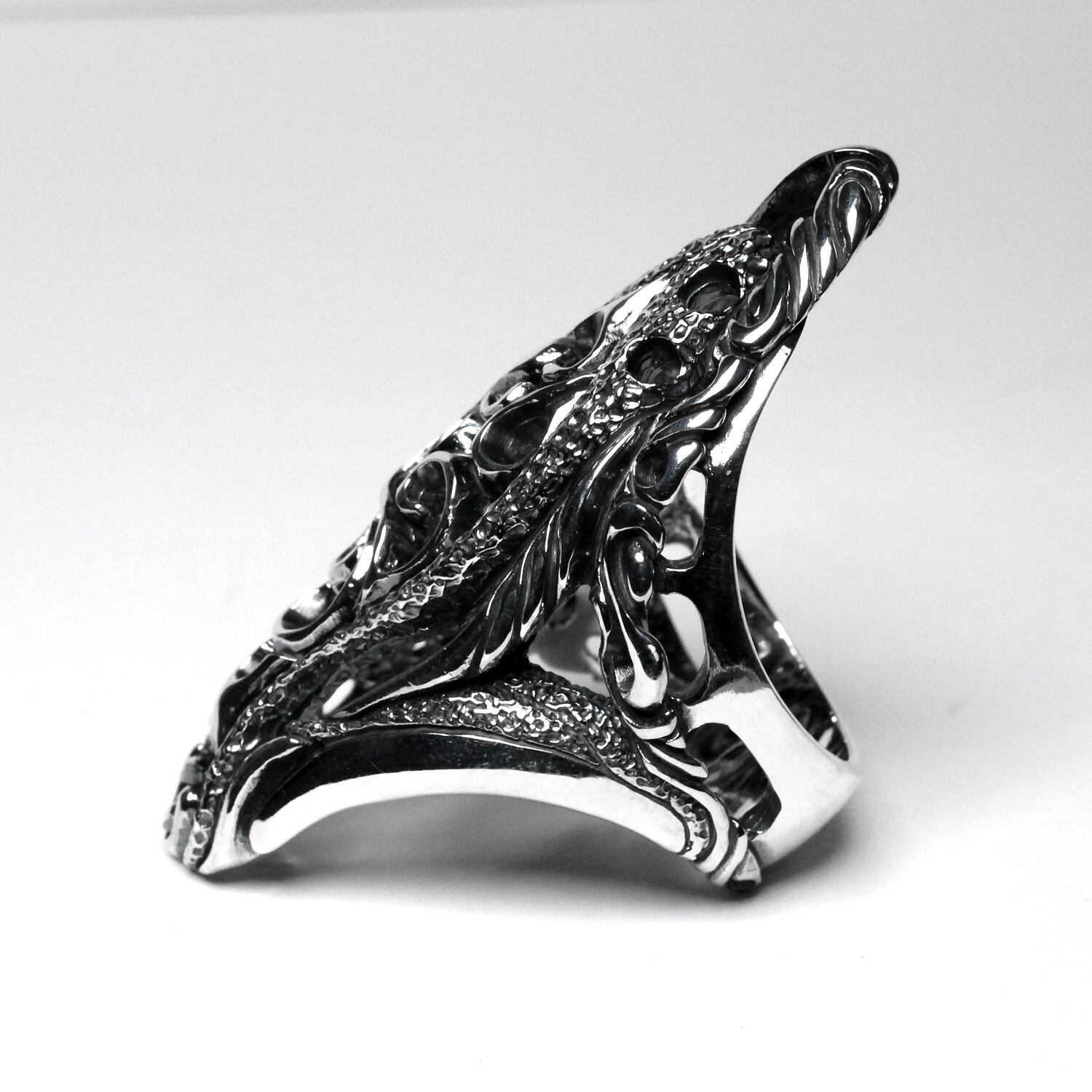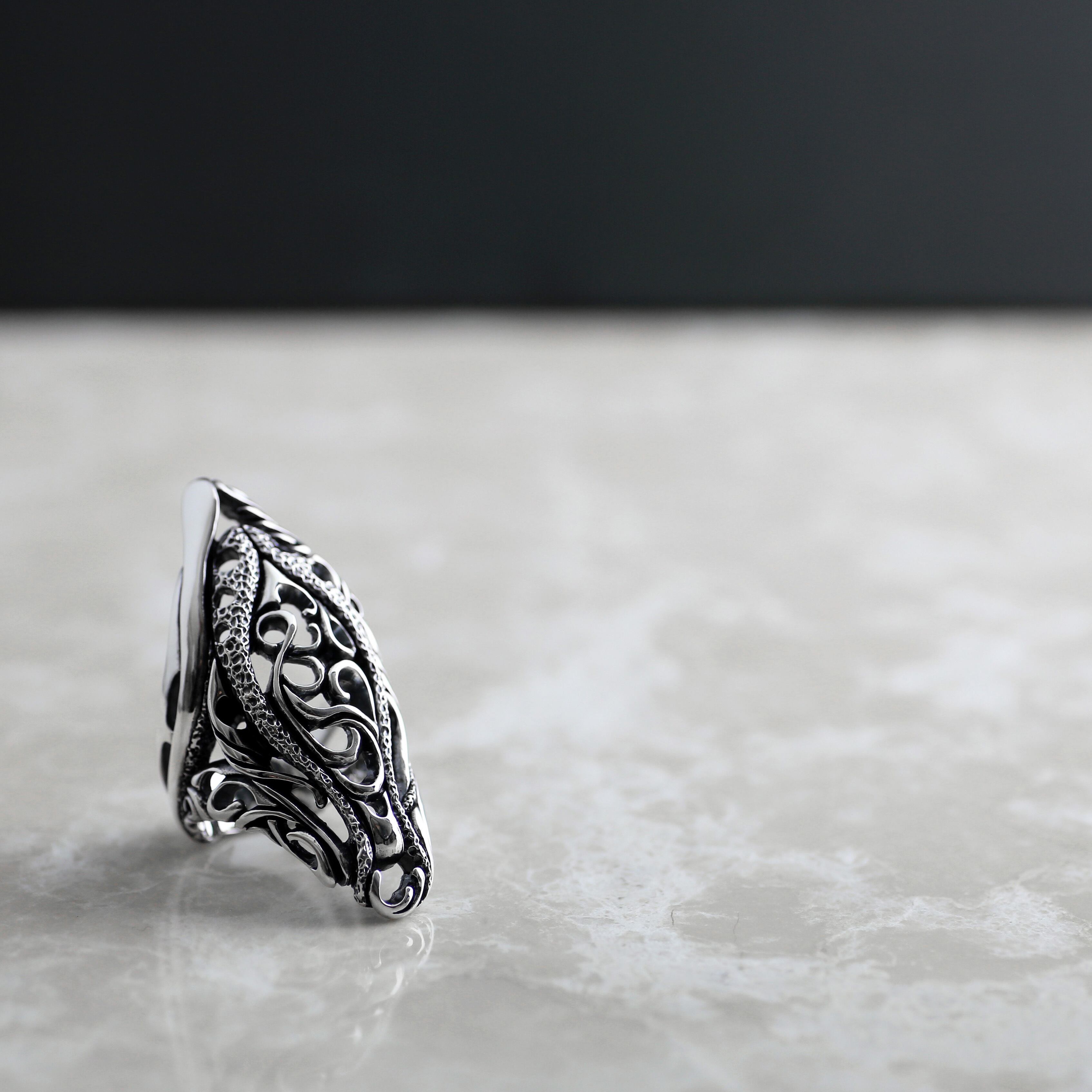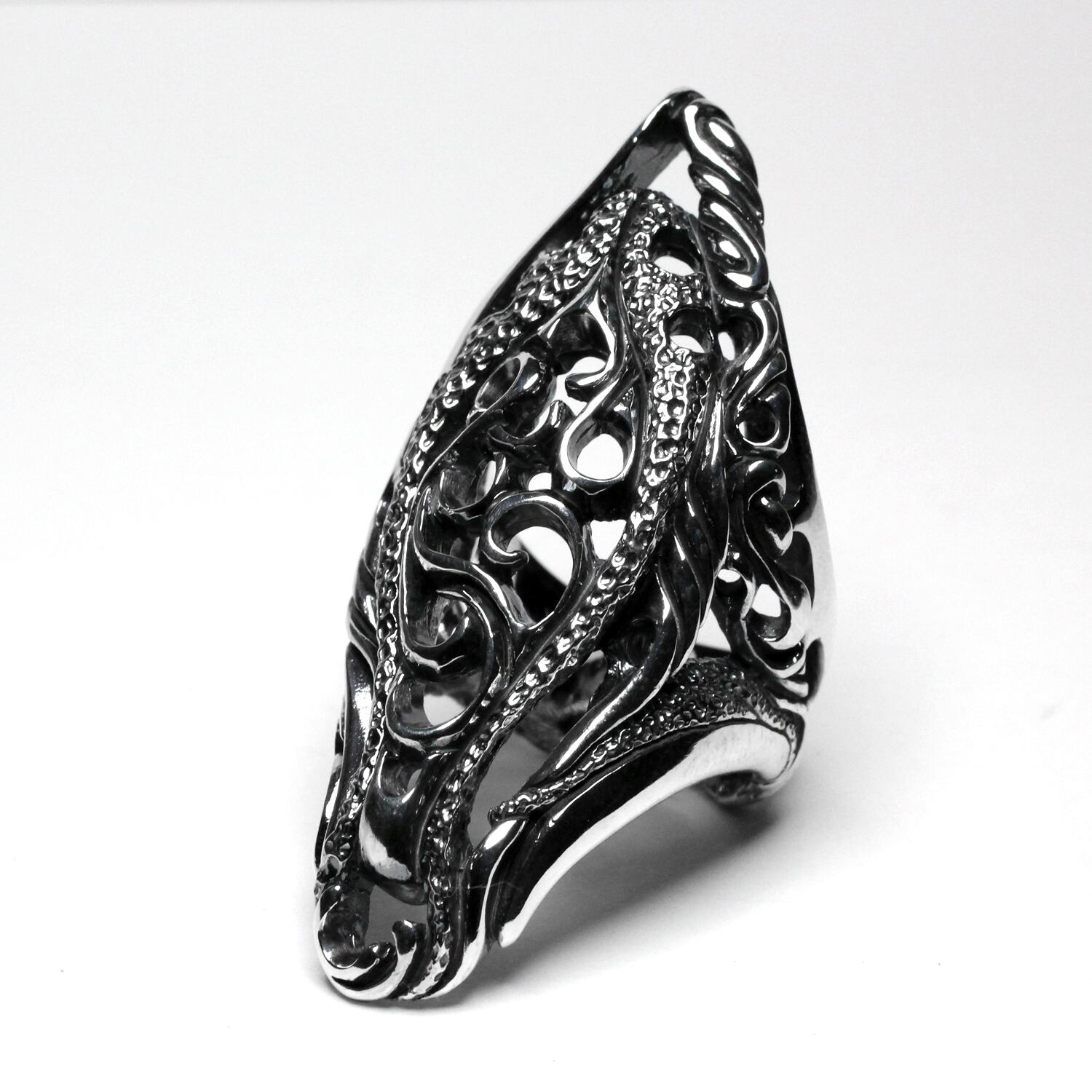 約55mmのインパクト抜群のリング。左右対称のシルエットだが、部分的に異なる曲線や曲面が不規則なようでまとまった逸品。