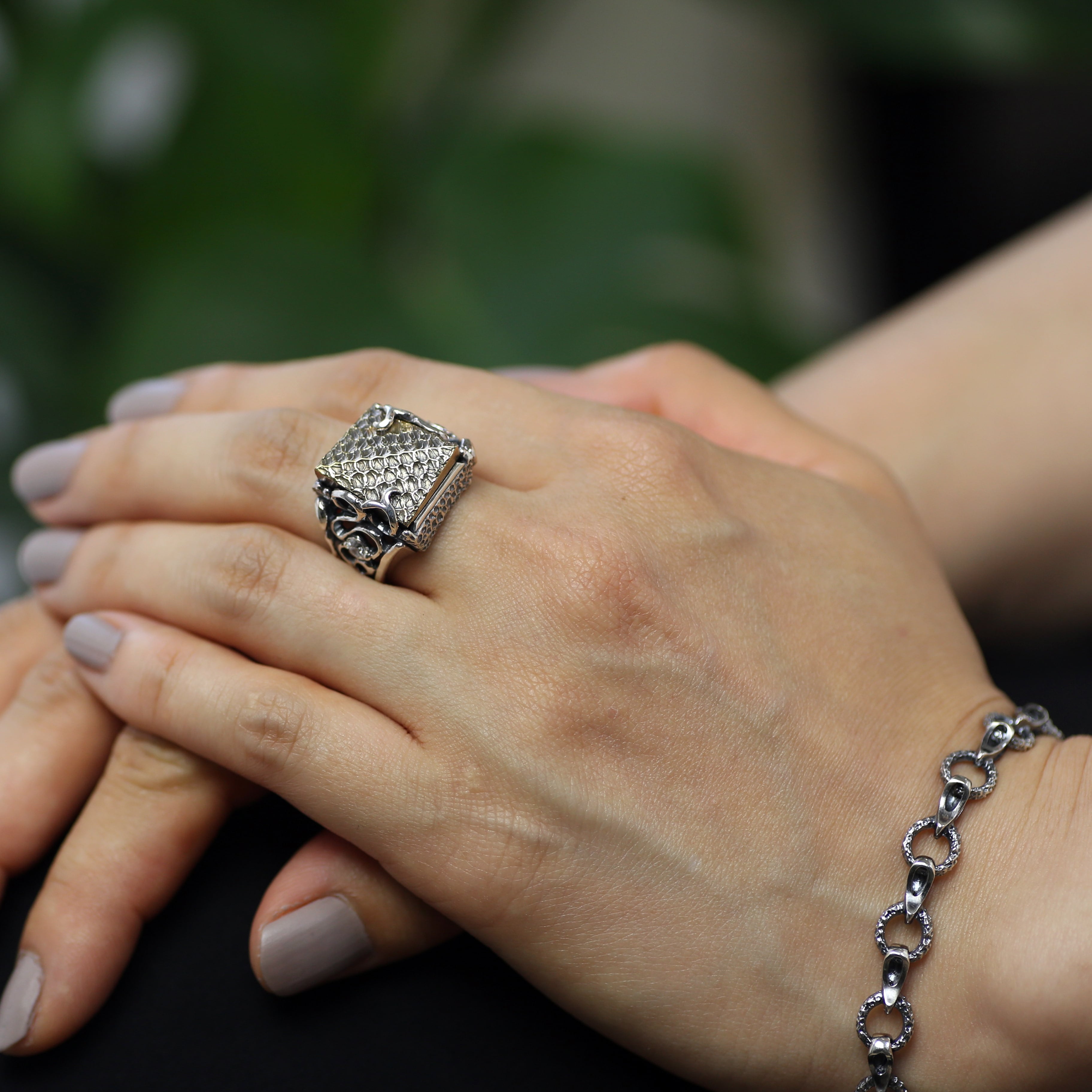 サイドから伸びたラインワークとさりげなくあしらったジルコニアが輝くゴージャスなリング。