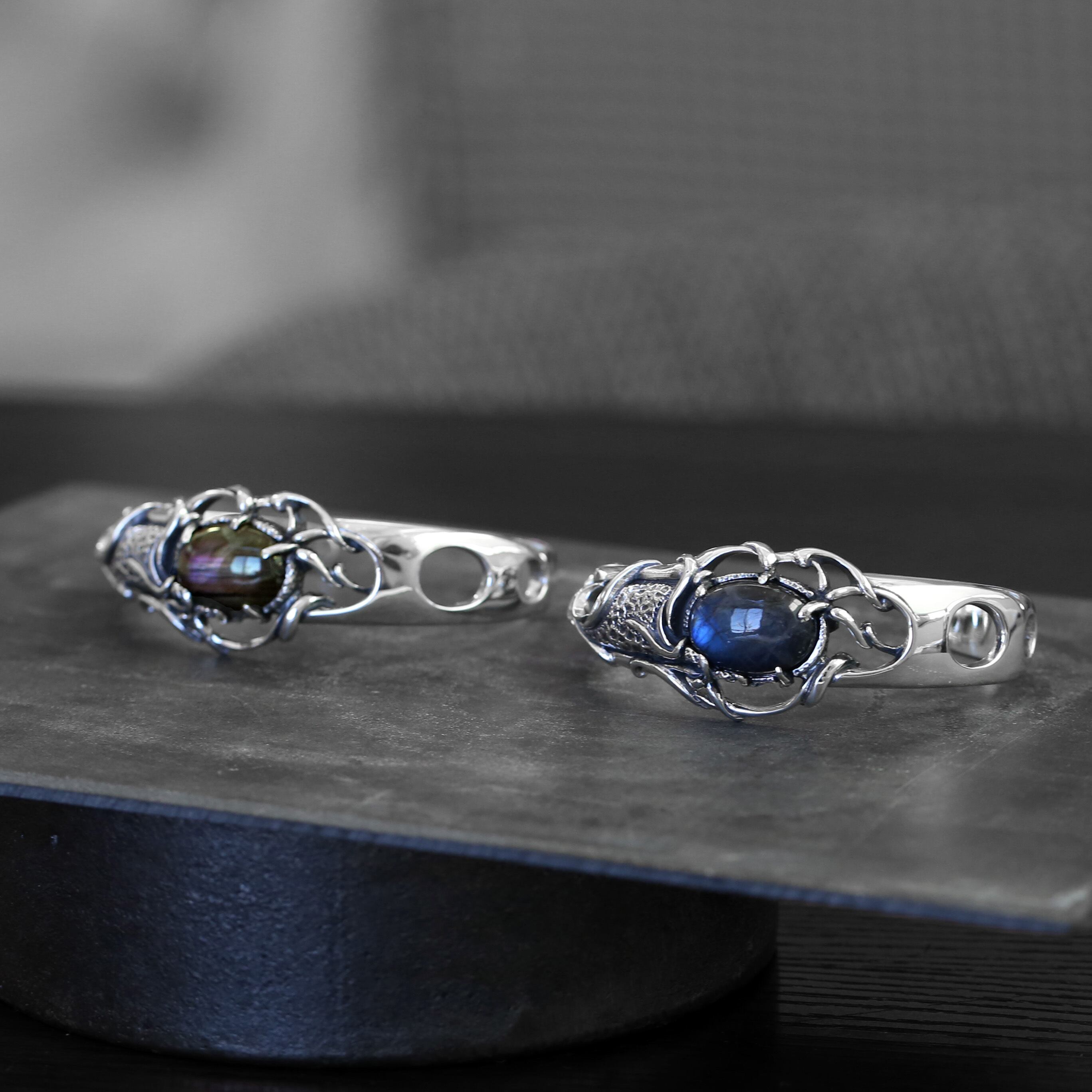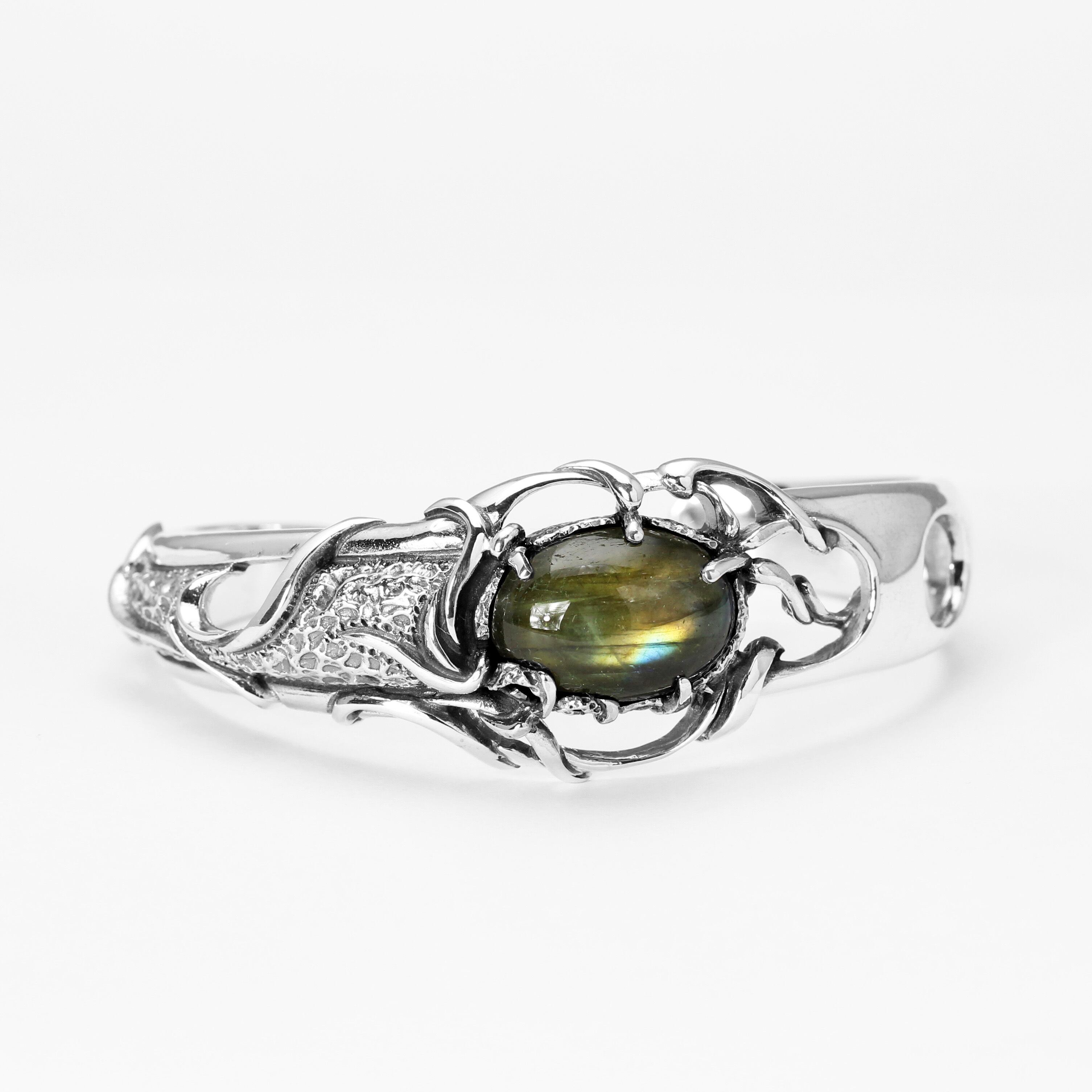 ラブラドライトを中心に左右でデザインが異なり、包み込むような曲線が魅せる存在感抜群のバングル。